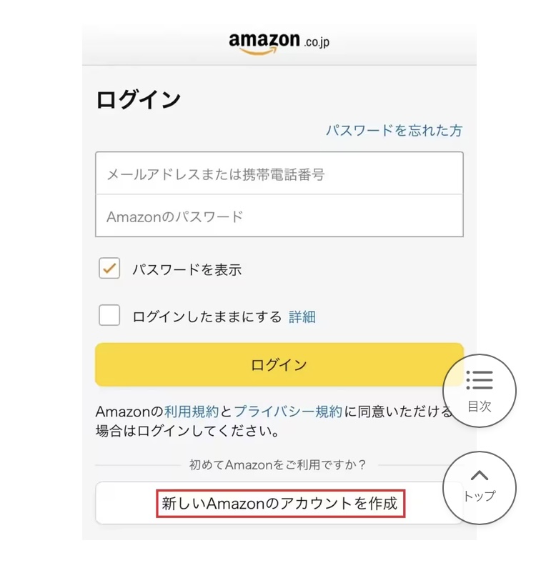 - Amazonアカウントにログインします。アカウントがない場合は、新規作成が必要です。